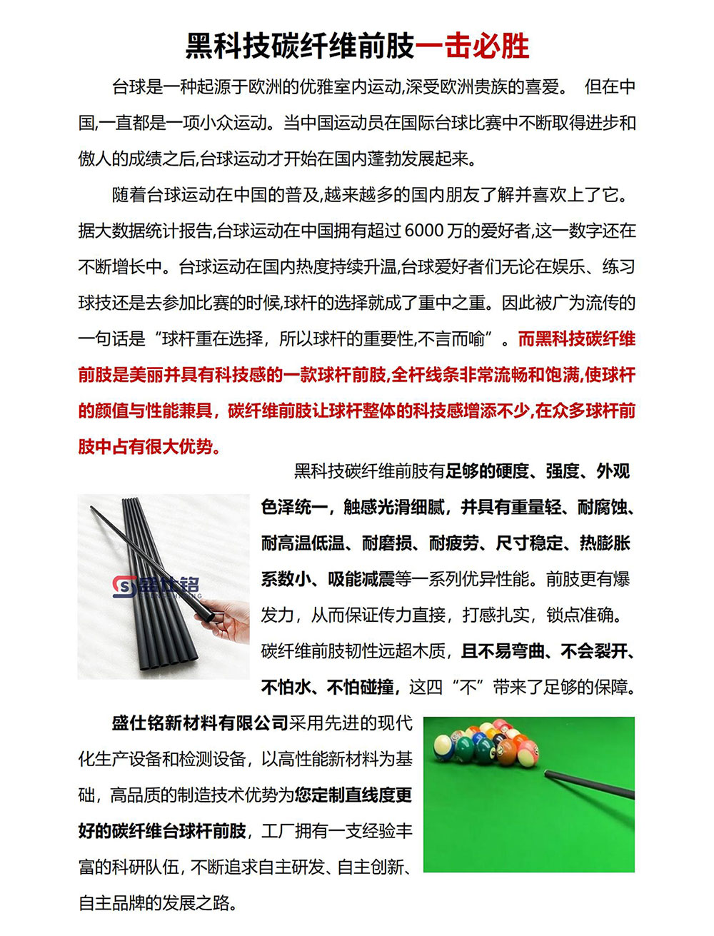 盛仕铭新材料有限公司采用先进的现代化生产设备和检测设备,以高性能新材料为基础,高品质的制造技术优势为您定制直线度更好的碳纤维台球杆前肢,工厂拥有一支经验丰富的科研队伍,不断追求自主研发、自主创新、自主品牌的发展之路。 |